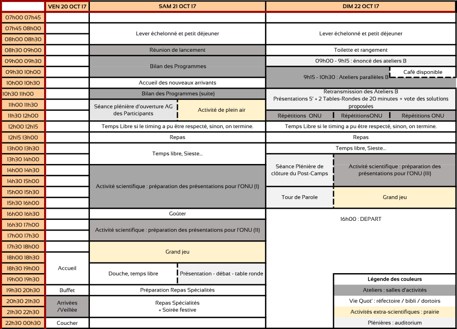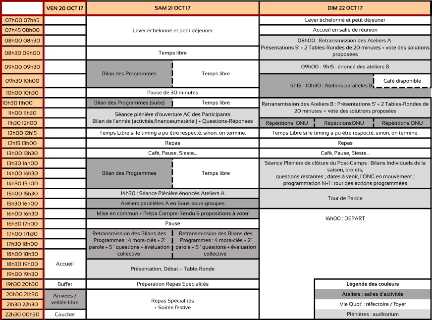 لقد وضع برنامج الجمعية العامة للمشتركين التي يقام خلال الدورات التي تلي المخيمات (انظروا إلى الأسفل) كي يسمح بالشفافية ويسهل المشاركة من ناحية المشتركين الذين يودون القدوم للرؤية، السمع، والمشاركة .